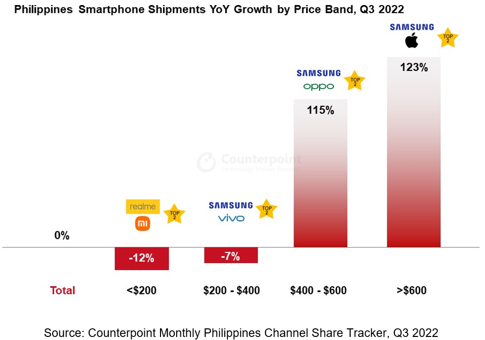 依据Counterpoint最近发布的菲律宾月度智能手机途径比例追寻陈述,2022年第三季度菲律宾的智能手机出货量仍同比相等。这一数字反映了较其各邦邻而言,该国宏观经济坚持相对平稳。本季度,菲律宾面对较低通胀压力,跟着本乡商场较上年同期有必定程度的复苏,顾客开销也有所添加。不过,因为商场还未到达正常水平,添加没有开端。