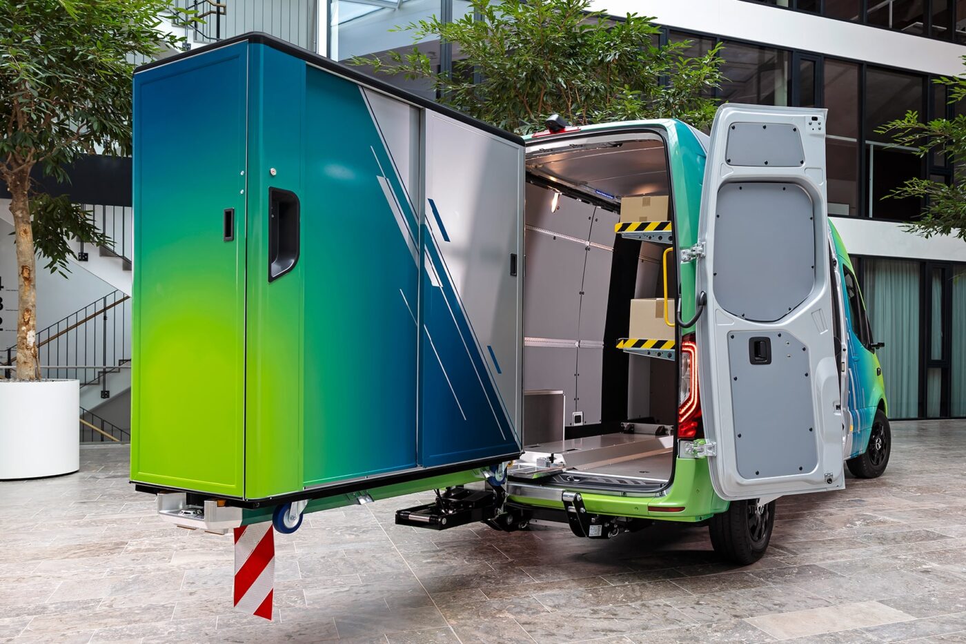 带脚轮的特别容器可供给超越 2 立方米的负载体积和高达 200 公斤的有用负载。它们能够针对各种使用进行灵敏装备,例如包裹投递。梅赛德斯-奔驰 Sustaineer 装备了专门针对此使用而开发的用于集装箱的集成提高臂。集装箱升降机选用液压方法作业,具有凹进式输送机滚筒,并可经过手持式发射器进行电子操控。这使得运送箱能够快速、安全、轻松地装卸。两个集装箱可装入新式 eSprinter 中,作为一辆高顶长板卡车。尽管如此,货架体系依然有满足的空间来运送额定的大件货品。能够经过右侧后门随时拜访货架体系(即便在集装箱已装载时)。