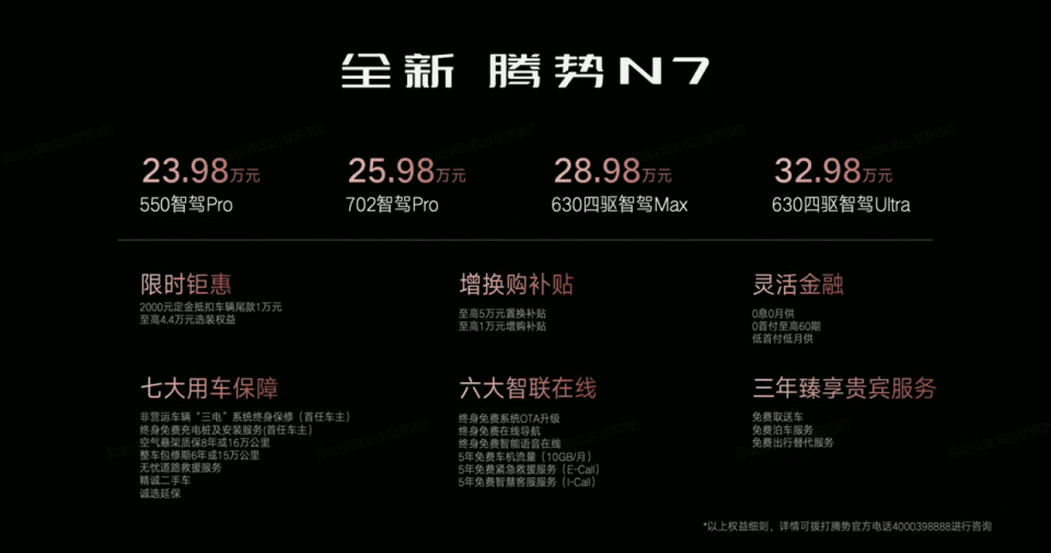 值得一提的是,立刻下定全新腾势N7,可享定金2000元抵扣车辆尾款10000元上市权益。一起,为感恩回馈老用户,腾势轿车不只推出了至高50000元的置换补助,适当于0元换新,并且还有十分给力和周到的权益,让老用户买车更定心、换车更高兴、用车更适意。