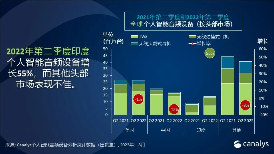 依据Canalys发布的最新统计数据,2022 年第二季度全球个人智能音频设备出货量同比下降 1.7% 至 9810 万部。作为全球第三大个人智能音频设备商场,印度在本季度完成了逆势而上,出货量大幅增加 55.0%。但印度的增幅不足以抵消全球商场的全体下滑,其间美国下降了 1%,我国下降了 13%。TWS是仅有完成增加的个人智能音频设备品类,增加了 8%,到达 6300 万部。印度是该品类完成增加的首要驱动力。尽管出货量有所增加,但TWS商场价值下降了 2.9%,这意味着宏观经济的下行严峻影响了厂商的赢利。