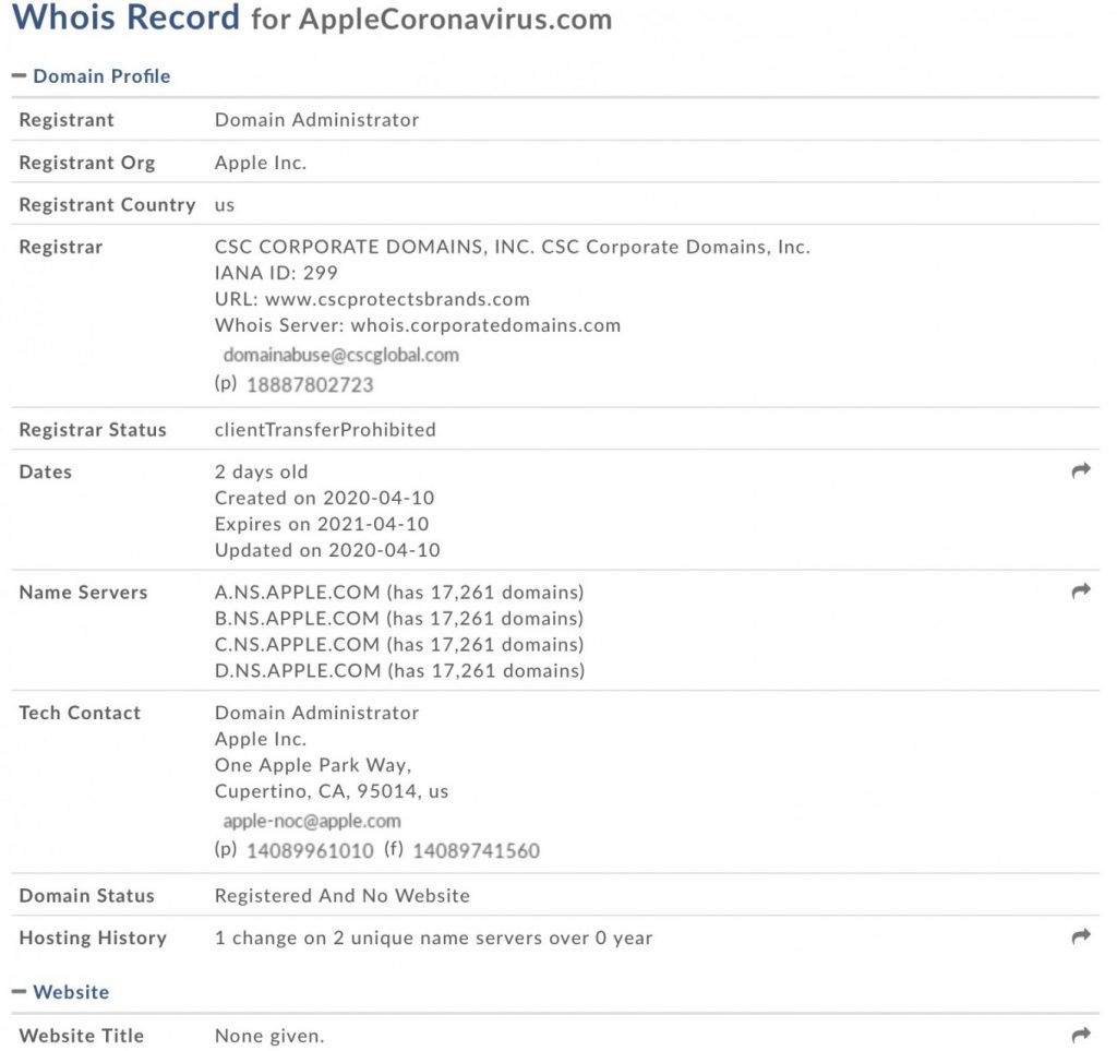 报导,苹果注册了 AppleCoronavirus.com 域名。WHOIS 记载